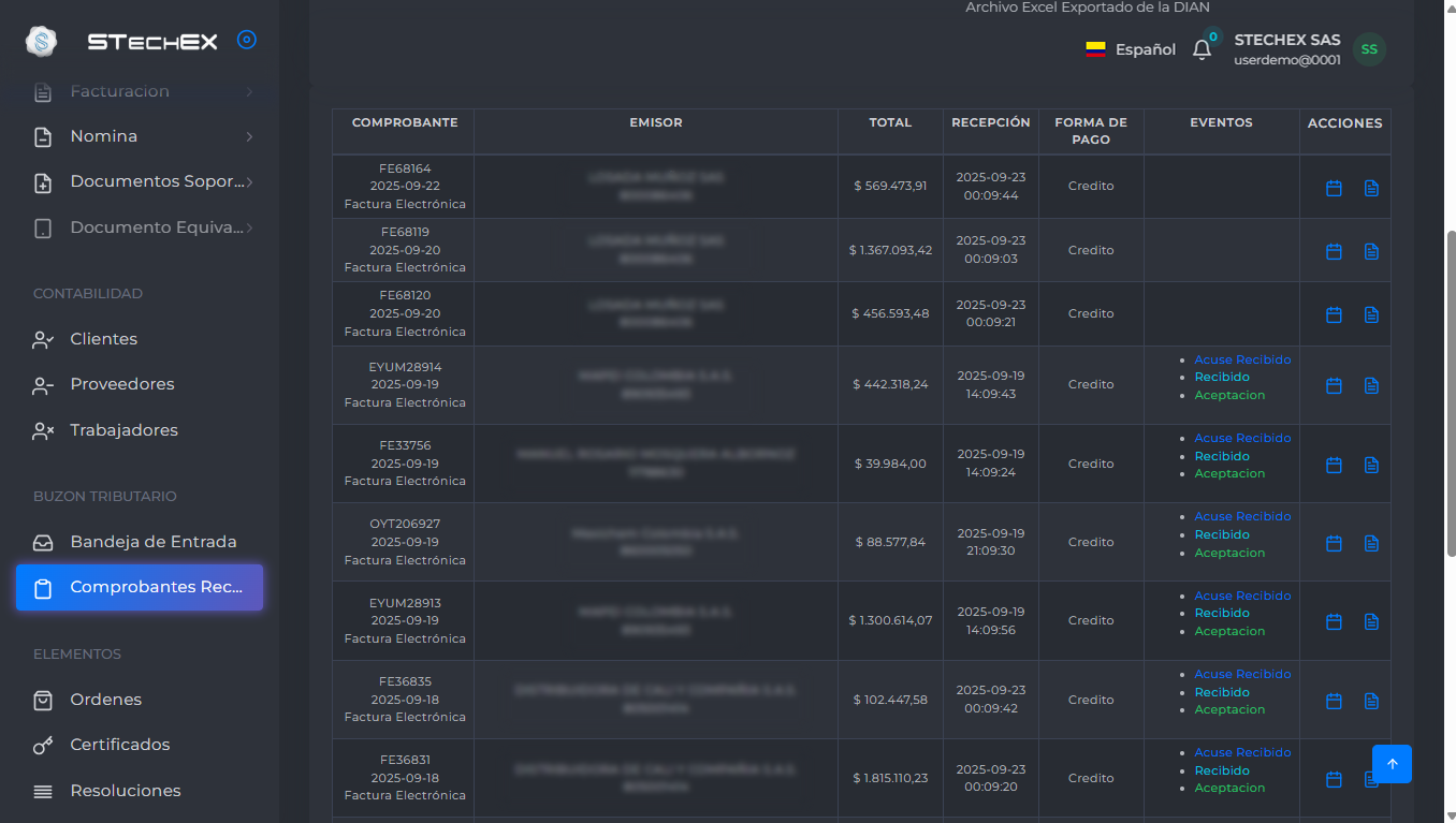Se importa el archivo a la plataforma Stechex y este es procesado y almacenado en su cuenta para su posterior auditoria y firmado de eventos correspondientes a la factura.